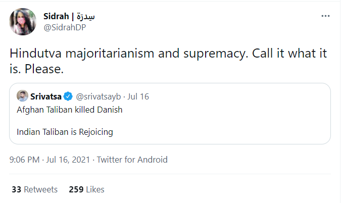 Popular Islamist Sidrah was visibly enraged and corrected Srivatsa immediately. She stated, “Hindutva majoritarianism and supremacy. Call it what it is. Please.”