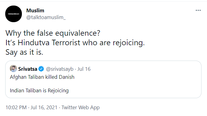 Twitter account ‘Muslim’ pleaded, “Why the false equivalence? It’s the Hindutva Terrorist who are rejoicing. Say as it is.”
