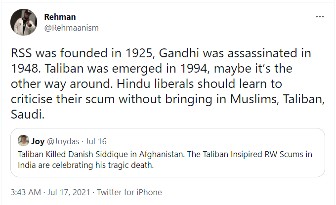 Another Islamist, Rehman, wrote, “RSS was founded in 1925, Gandhi was assassinated in 1948. Taliban was emerged in 1994, maybe it’s the other way around. Hindu liberals should learn to criticise their scum without bringing in Muslims, Taliban, Saudi.”