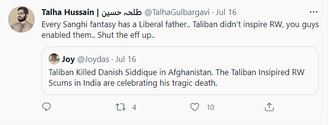 One Talhan Hussain alleged that every Sanghi was borne out of a liberal father. With that assumption in mind, he slammed Joydas and wrote, “Taliban didn’t inspire RW, you guys enabled them.. Shut the eff up.”