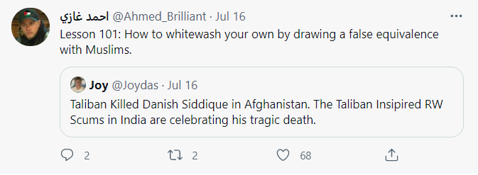 While reacting to the tweet by ‘liberal’ Joydas, Islamist (@Ahmed_Brilliant) claimed, “Lesson 101: How to whitewash your own by drawing a false equivalence with Muslims.”