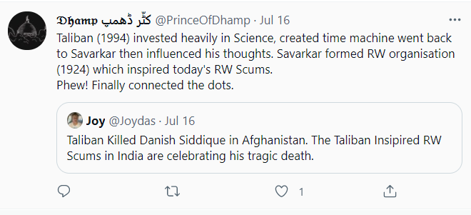 Islamist, who goes by the username @PrinceOfDhamp, insinuated that Veer Savarkar was somehow the one who inspired the Taliban to become radical. In a desperate attempt at sarcasm, he wrote, “Taliban (1994) invested heavily in Science, created time machine went back to Savarkar then influenced his thoughts. Savarkar formed RW organisation (1924) which inspired today’s RW Scums. Phew! Finally connected the dots.”