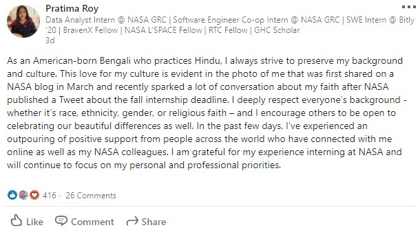 Now, Pratima Roy has penned a post on LinkedIn where she has unapologetically stood by her faith and thanked others for their support. She said, “As an American-born Bengali who practices Hindu, I always strive to preserve my background and culture. This love for my culture is evident in the photo of me that was first shared on a NASA blog in March and recently sparked a lot of conversation about my faith after NASA published a Tweet about the fall internship deadline.”