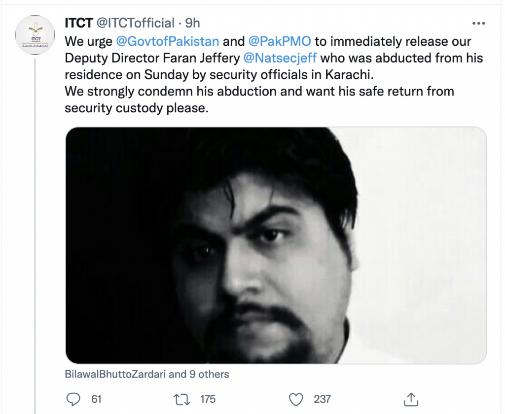 The ITCT has condemned his abduction and appealed to Pakistan government for his immediate release.