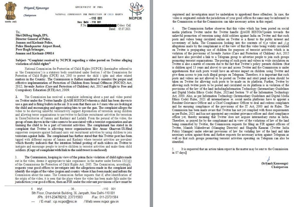 It was after KRF flagged the issue, the statutory body took cognisance of the case and wrote to the DGP of Jammu and Kashmir: “The commission has received a complaint informing about a post and video posted on Twitter under the Twitter handle @AGH HISTOrY wherein a child is shown to use a gun and is firing bullet in the air. It is seen that there are 4-5 men who are looking at the child and encouraging and appreciating to use the gun. The complaint alleges the video to be showing unlawful terror activity support and promotion of terrorism using children and allowing terror organisations to use Twitter to facilitate recruitment activities for terrorism in UnionTerritories of Jammu and Kashmir and Ladakh”, read the NCPCR letter.