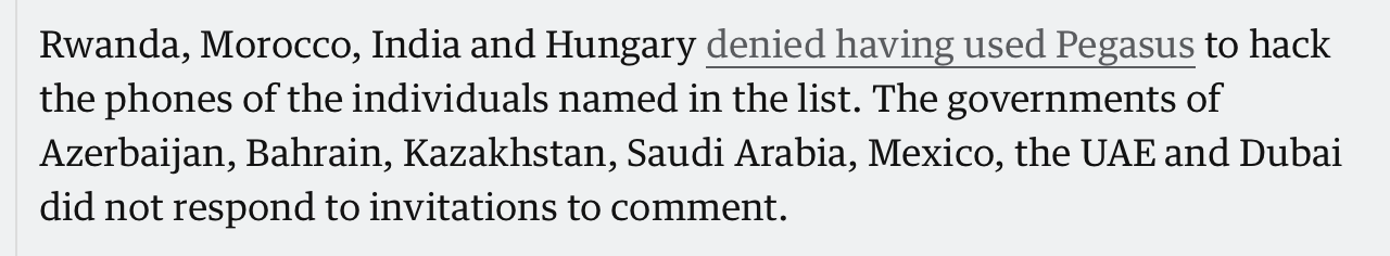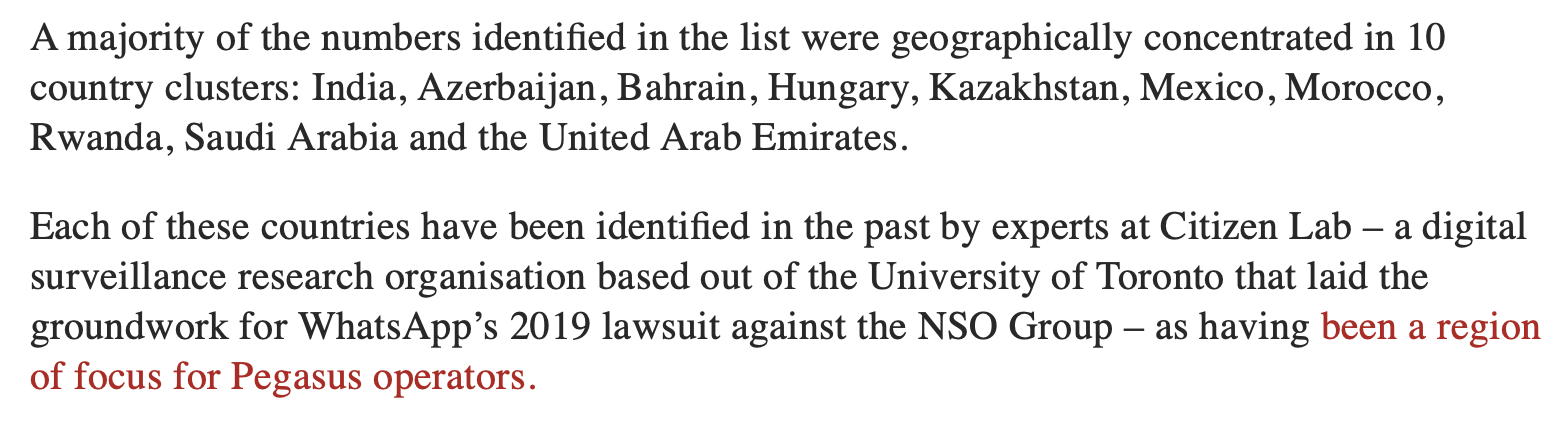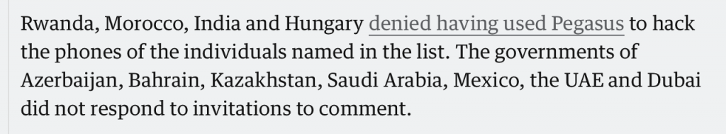 While saying that Pegasus is used by “authoritarian regimes” to “spy”, they have actually not substantiated their point in the least. Now, is it possible that some governments across the globe use it illegally? Absolutely. It is not hard to believe that some governments may want to illegally, beyond the realm of law, spy on their assets. But does this automatically mean all governments that the Guardian has mentioned are doing that? There is no evidence to support that theory, per their own admission.