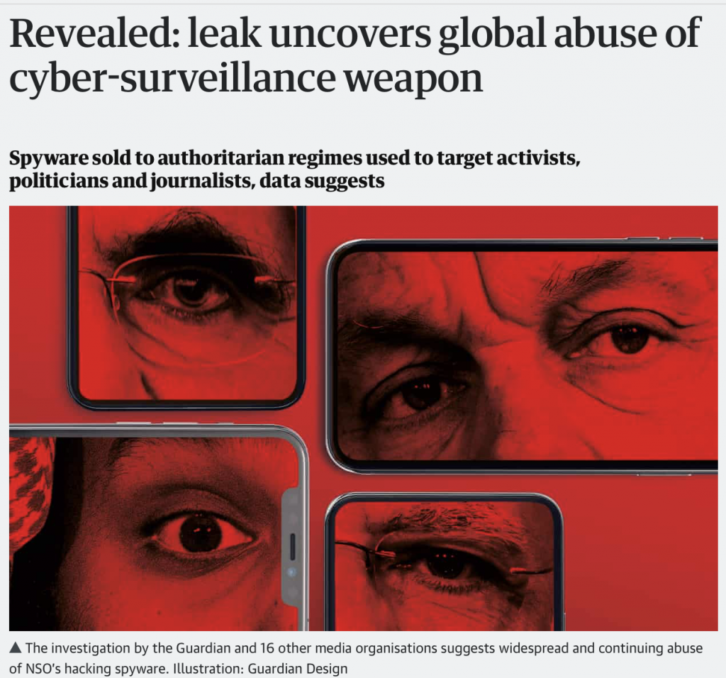 The first report on the matter that was published by The Guardian was headlined, “Revealed: leak uncovers global abuse of cyber-surveillance weapon”. Following the headline, the first line one reads is – “Spyware sold to authoritarian regimes used to target activists, politicians and journalists, data suggests”.