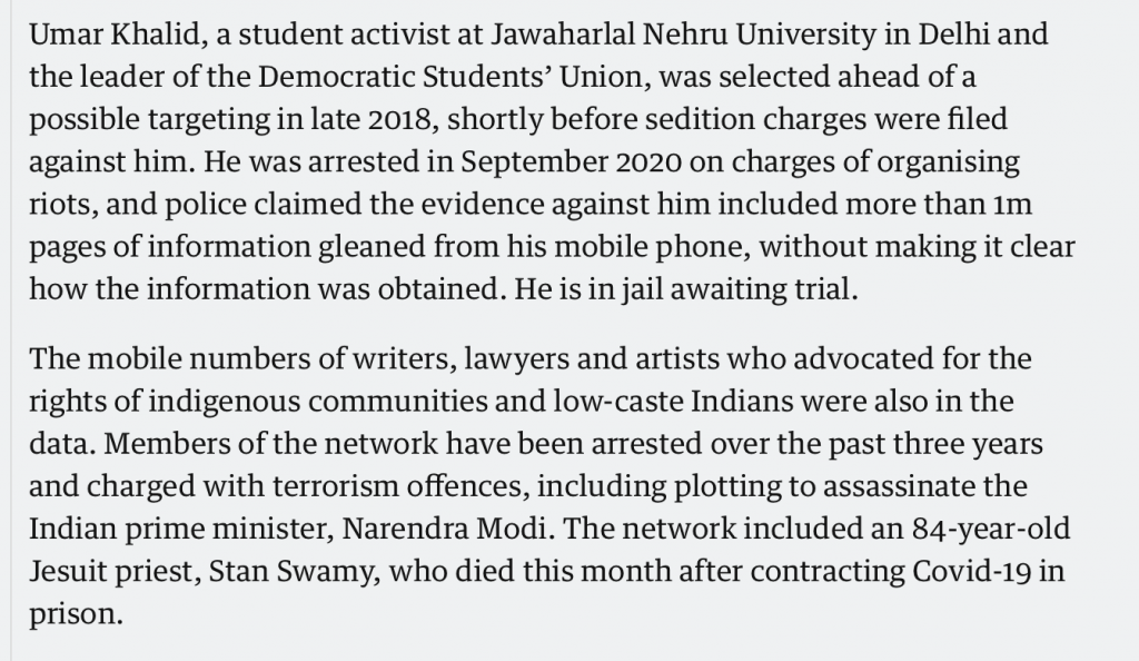 The Guardian report says that Umar Khalid was “selected” for surveillance ahead of sedition charges were brought against him. It further alludes, hints, ever so nonchalantly that the police filed a chargesheet with information from his phone, without explaining how they obtained such information.