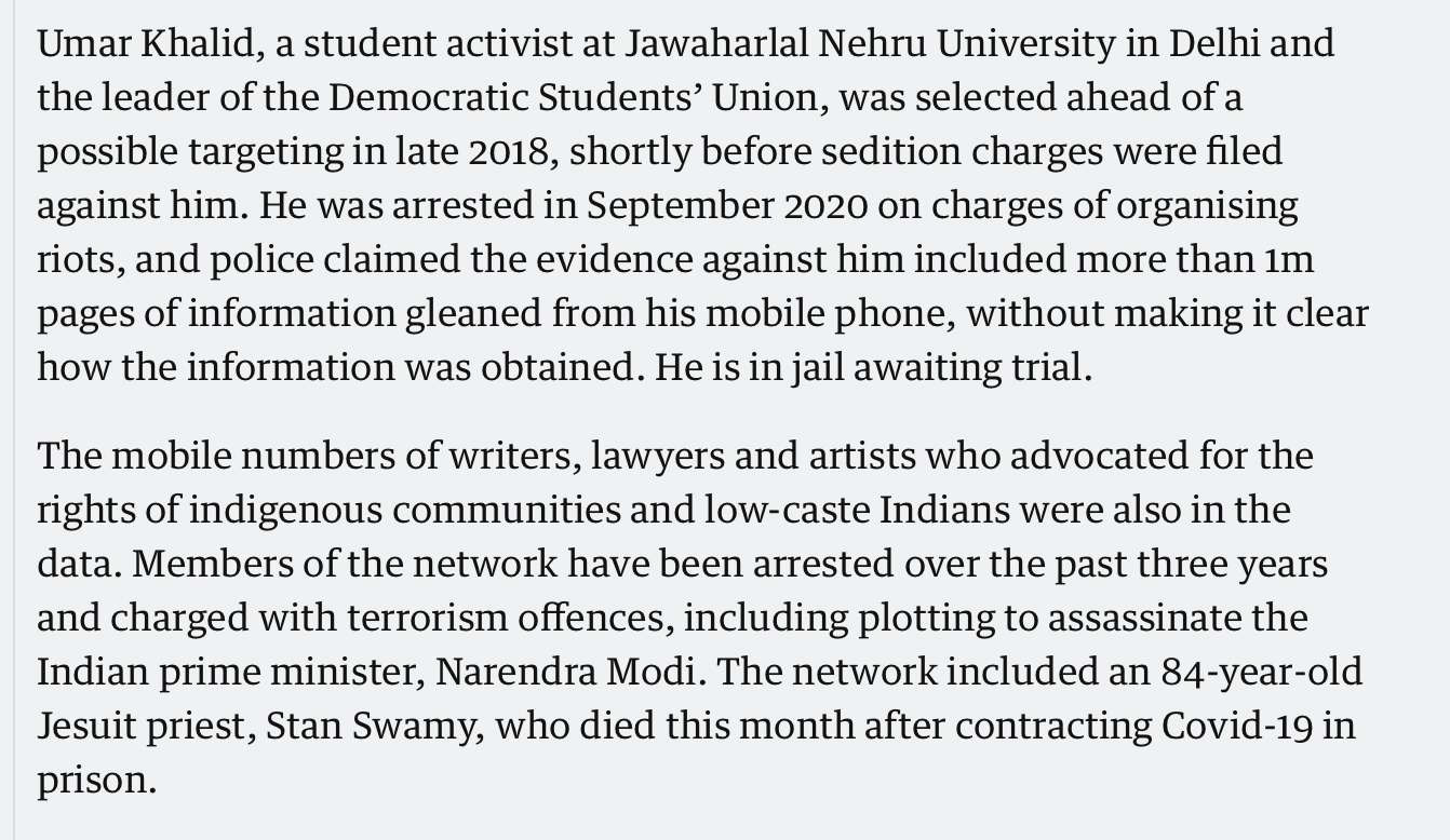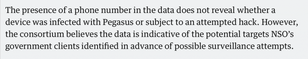 But here is the catch. The report itself says that the presence of a phone number in the data does not reveal whether a device was infected with the spyware or not. So what does indicate that it was? Well, nothing really. It is their BELIEF that the data is INDICATIVE of the POTENTIAL TARGETS of NSO’s clients. Just the variables in this one sentence is rather staggering. Not just that, there is nothing in their story that indicates to a certainty that an Indian activist, if targeted at all, was targeted by the Indian government. They are only relying on their readers’ naivety to make that tenuous links themselves.