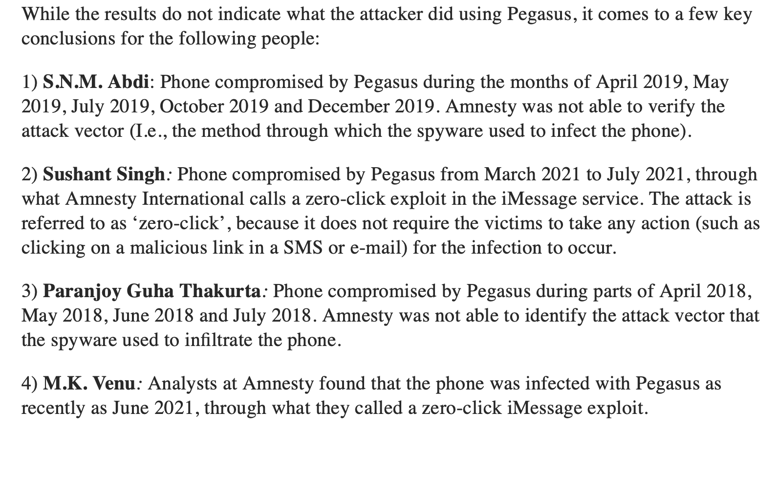 Amnesty found evidence that the phones of Sushant Singh, Thakurta, Abdi, Varadarajan and Venu were compromised with Pegasus spyware. For Smita Sharma, the analysis found evidence of a hacking attempt through a vulnerability in Apple’s iMessage system, but nothing to indicate that her phone was successfully infected. Vijaita Singh’s Android phone also showed evidence of an attempted hack, but no evidence of a successful compromise was detected.