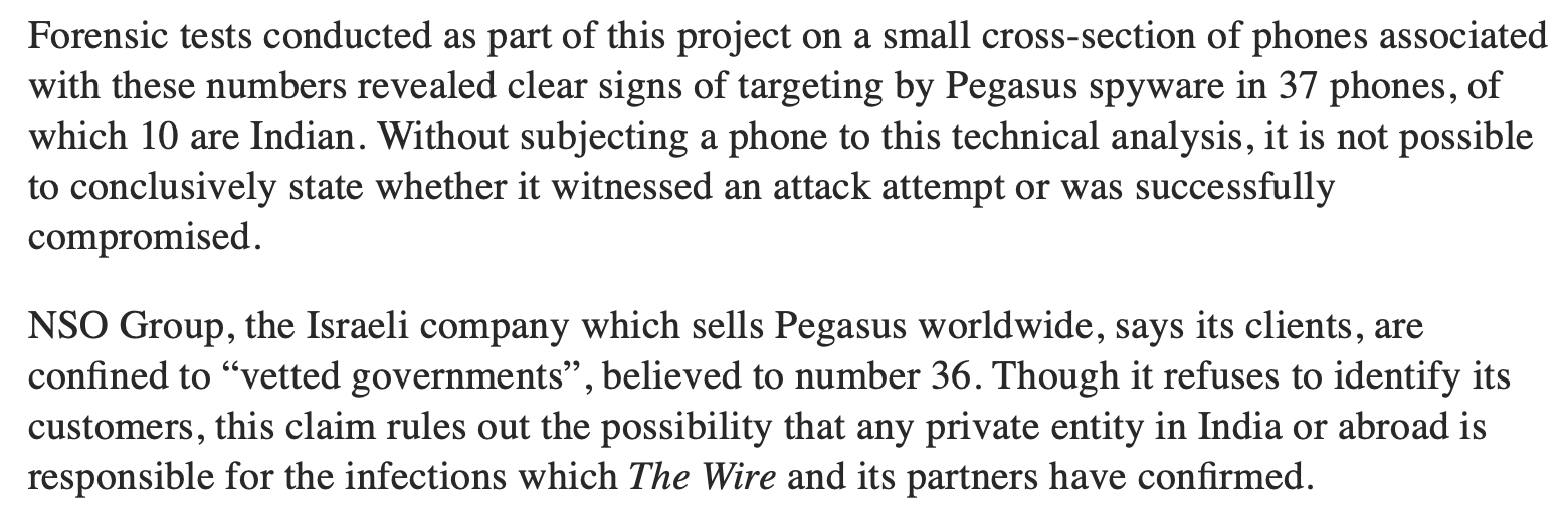 TheWire categorically says that they have NO IDEA what the “attacker” did with “Pegasus”, however, it goes on to glorify some journalists, especially those associated with TheWire itself, by making certain conclusions.
