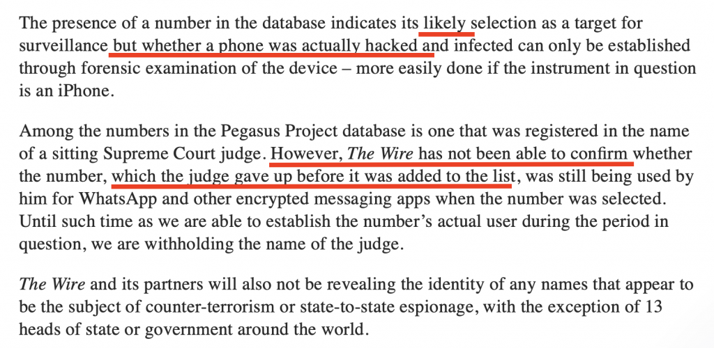 Now notice how TheWire writes to insinuate things they absolutely cannot prove. They say that the database INDICATES its LIKELY selection for target of surveillance. BUT they cannot prove that a phone was hacked without forensic tests (Forensic tests were done on a fraction of the database). They further allude to a judge being hacked. HOWEVER, they say that TheWire HAS NOT BEEN ABLE TO CONFIRM whether the number was hacked, incidentally, a number that the judge GAVE UP BEFORE IT WAS ADDED TO THE DATABASE.