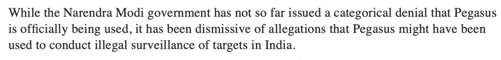 Further, while the Guardian story clearly says that the Indian govt denied using Pegasus, TheWire brings in India to claim that NSO said no “private entity in India or abroad is responsible for the infections which The Wire and its partners have confirmed”.