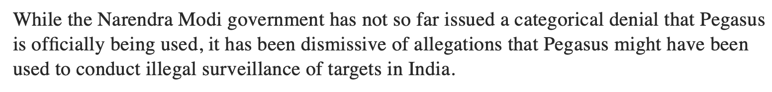 2. If the Indian government has denied using Pegasus and the NSO has said that many clients on the purported list are not their clients to begin with, how are these conjectures being made against the Modi government? Here it is important to assert that NSO group in a statement issued earlier today said that it is contemplating suing TheWire for defamation.