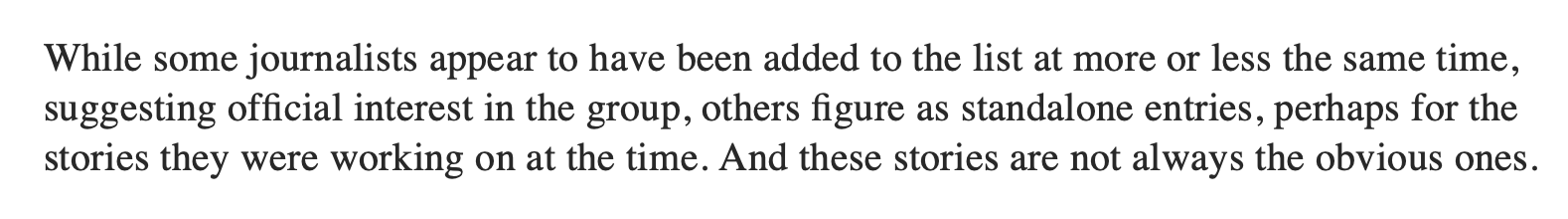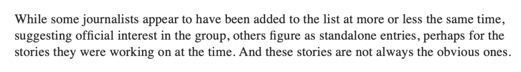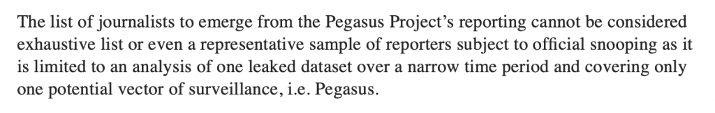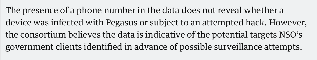 But they just told us in the preceding paragraph that they simply have no proof. What they have is the possibility that traces were found in a minuscule percentage of the phones out of the “small number of phones” that they managed to analyse. Yet, they revealed 180 names on Sunday and plan to reveal other names incrementally.