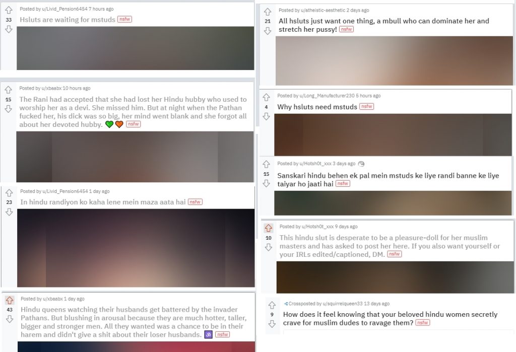 Several such subreddits have come on the platform, which claim that they share images of women claiming they are Hindus. The subreddits use explicit names, which call the Hindu women as sluts, who according to them are waiting for ‘Muslim studs’. Some of such groups on Reddit are r/dharmikrandis, r/Hinduslutsmuclimcock, r/Muslimbullvshinduslut, r/SanskariSlut, r/hindubitchmuslimbull and many more.