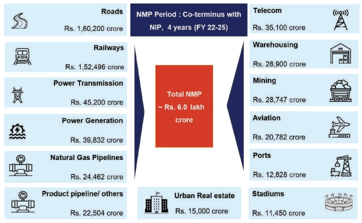 The National Monetisation Pipeline, developed by NITI Ayog, has identified infrastructure assets including roads, ports, airports, telecom, railways, warehousing, energy pipelines, power generation, power transmission, hospitality and sports stadiums for monetisation. Apart from these, assets from mining and housing redevelopment sectors have also been identified.