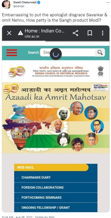 The Congress party and its coterie of sympathizers and trolls targeted the NDA Government at the center over a poster on the website of the Indian Council of Historical Research (ICHR) related to the ‘Azaadi ka Amrit Mahotsav’ where Jawaharlal Nehru was apparently missing.