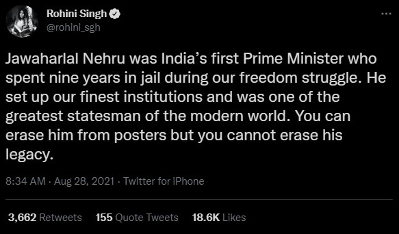 Disgraced ‘journalist Rohini Singh too opined on the matter. “Jawaharlal Nehru was India’s first Prime Minister who spent nine years in jail during our freedom struggle. He set up our finest institutions and was one of the greatest statesman of the modern world. You can erase him from posters but you cannot erase his legacy,” said Singh.
