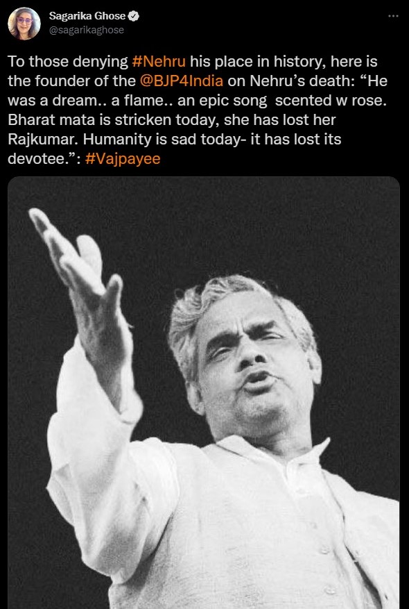 Sardesai’s wife, Sagarika Ghose, echoed similar sentiments. She relied on BJP stalwart Atal Bihari Vajpayee to peddle her agenda.