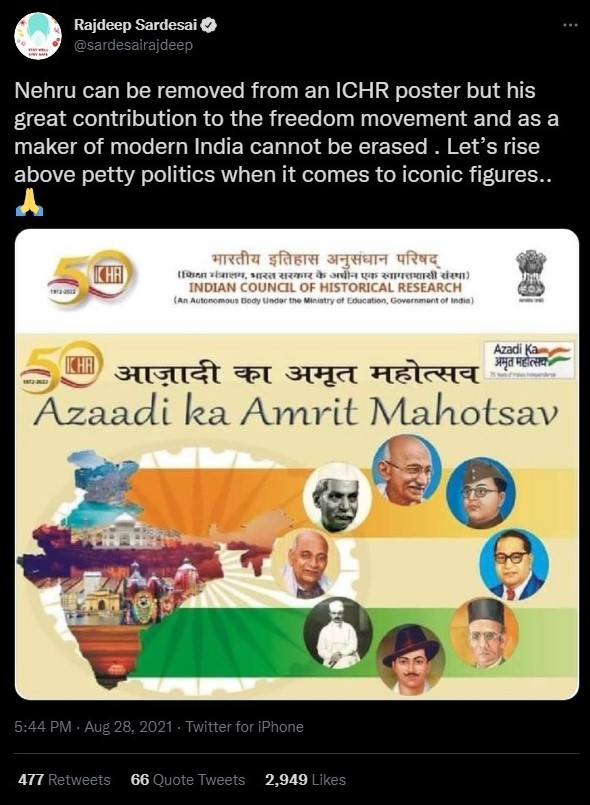 ‘Secular’ patrakar Rajdeep Sardesai commented, “Nehru can be removed from an ICHR poster but his great contribution to the freedom movement and as a maker of modern India cannot be erased.”