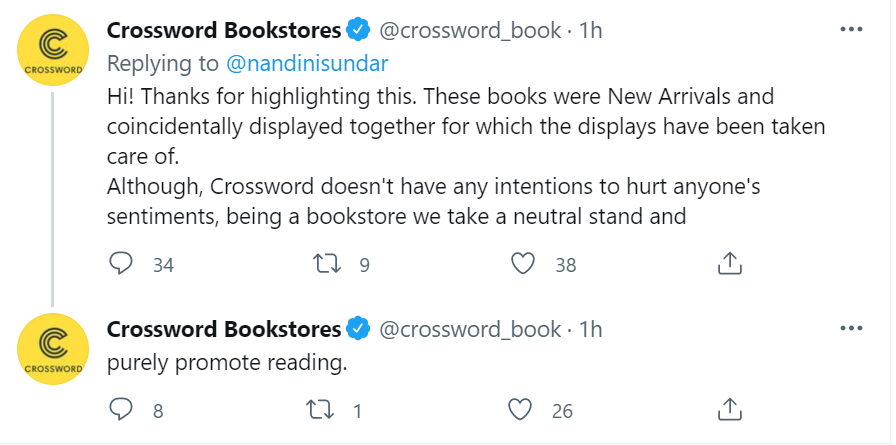 “Hi! Thanks for highlighting this. These books were New Arrivals and coincidentally displayed together for which the displays have been taken care of. Although, Crossword doesn’t have any intentions to hurt anyone’s sentiments, being a bookstore we take a neutral stand and purely promote reading,” the brand said in a Tweet.