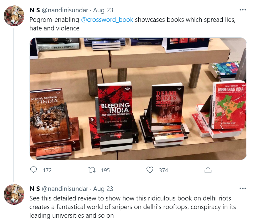 Sundar, a Delhi University professor and known Naxal sympathiser, who is also one of the speakers at the Dismantle Global Hindutva Conference, attacked the bookstore for featuring a fact-based book on Delhi Riots and other books by Garuda Prakashan. “Pogrom-enabling @crossword_book showcases books which spread lies, hate and violence,” Sundar Tweeted.