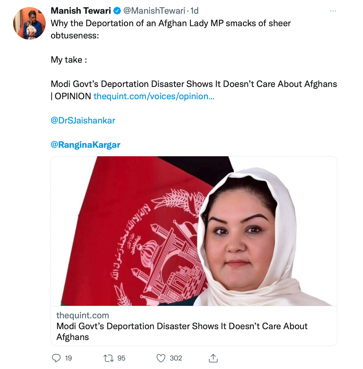 Former Union Minister Manish Tewari even penned an opinion piece, arguing how the deportation of an Afghan MP showed that the government of India did not care about Afghans, notwithstanding the fact that the Afghan parliamentarian did not flee from Afghanistan but had come from Turkey.
