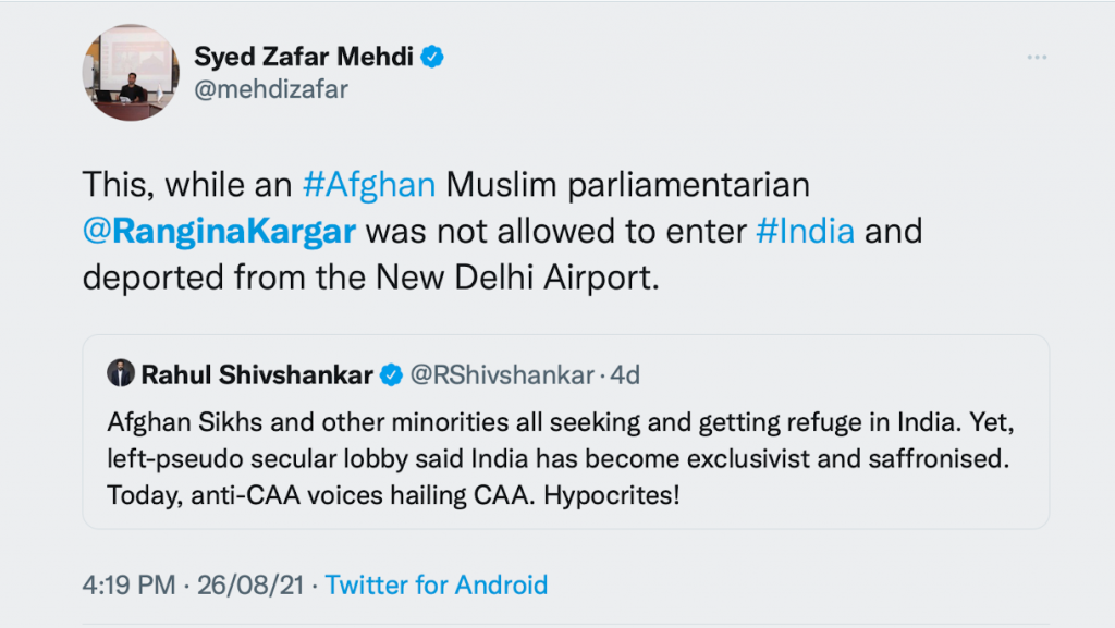 Soon after the news broke out, the left-liberal intelligentsia in the country, in their bid to attack the Modi government and paint it as anti-Muslim, lapped up the issue and accused the government of exercising religious discrimination. Several of the usual suspects took to social media to insinuate that the government deported the Afghan MP back because she was a Muslim while granting visas to hundreds of Hindus and Sikhs refugees from Afghanistan.