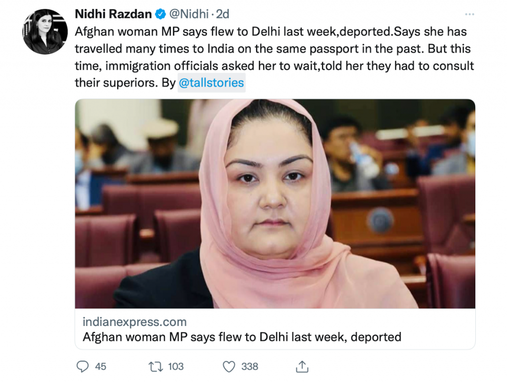 Nidhi Razdan, who worked for NDTV and was recently conned by the whiff of a too-good-to-be-true job offer at the prestigious Harvard University, also shared the article about the Afghan MP being deported by India.
