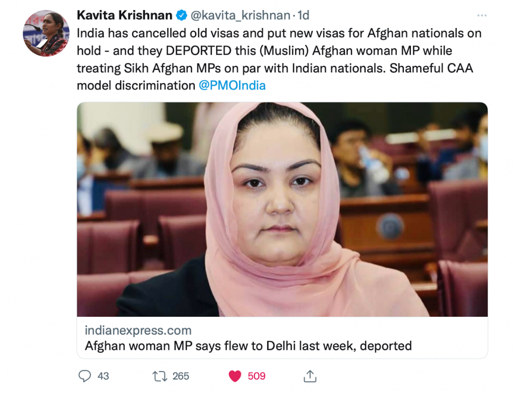 Kavita Krishnan, a communist leader who doubles up as a full-time protestor, also tweeted about the raging issue of deportation of the Afghan MP. Krishnan alleged that Kargar was discriminated against because she was a Muslim while Sikh Afghan MPs were treated on par with Indian nationals.