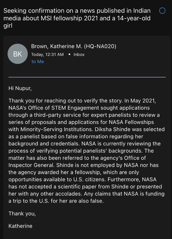 OpIndia seeking clarity on the matter had written to NASA specifically asking about Shinde’s claim of being selected for any fellowship, submitting research papers and being employed by NASA to review research papers.