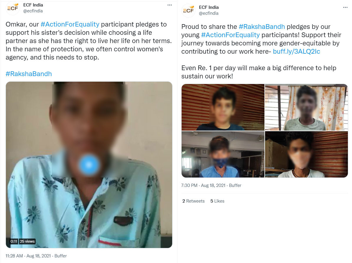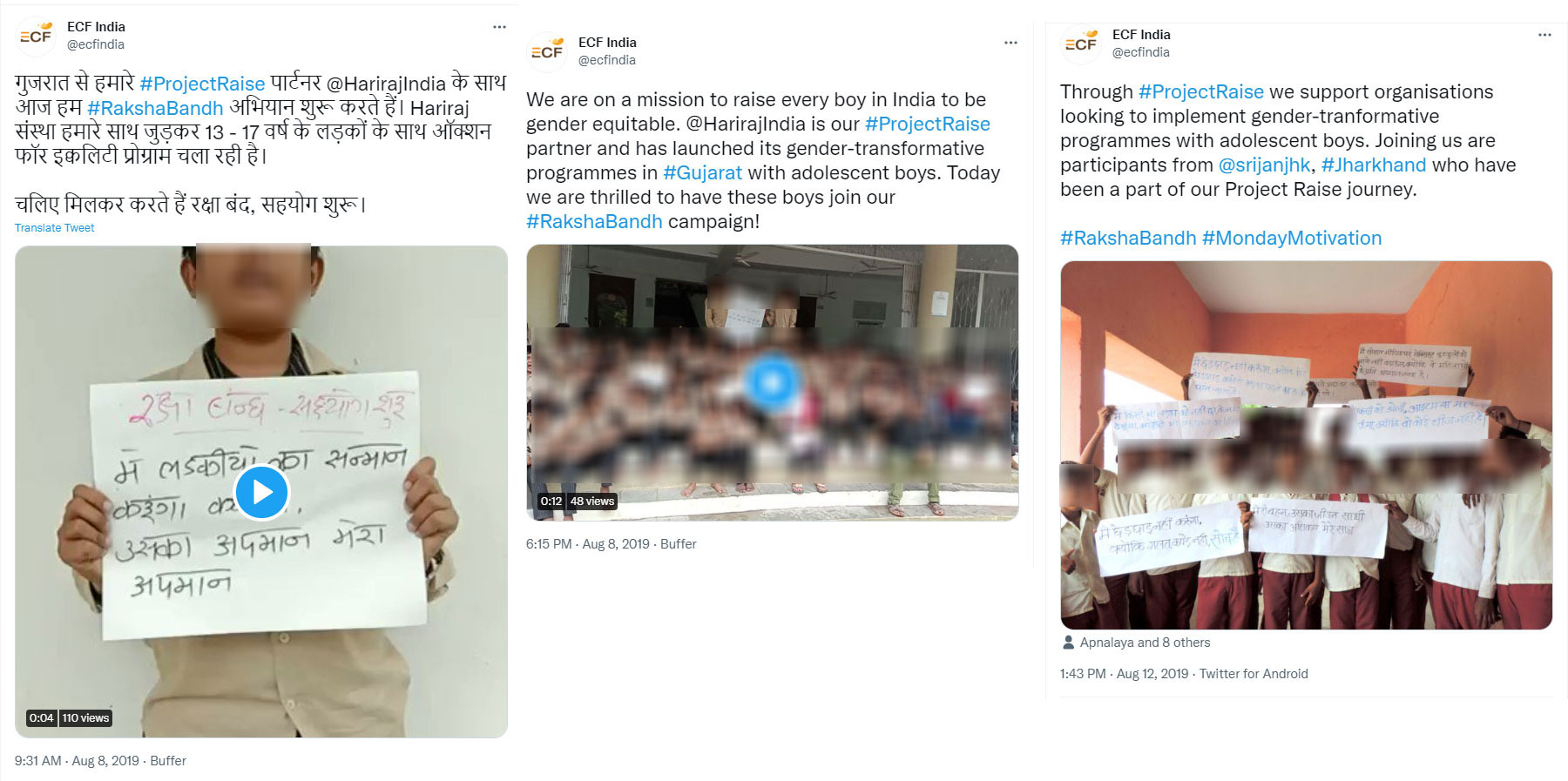 The video in question is not the only video that ECF has posted while trying to defame Raksha Bandhan. The #Rakshabandh campaign started in 2018, and initially, they used adult men and women for the campaign. Tweets by the group can be seen here. Later, in 2019, they started using children for the campaign and posted the first video with a child on August 8, 2019.