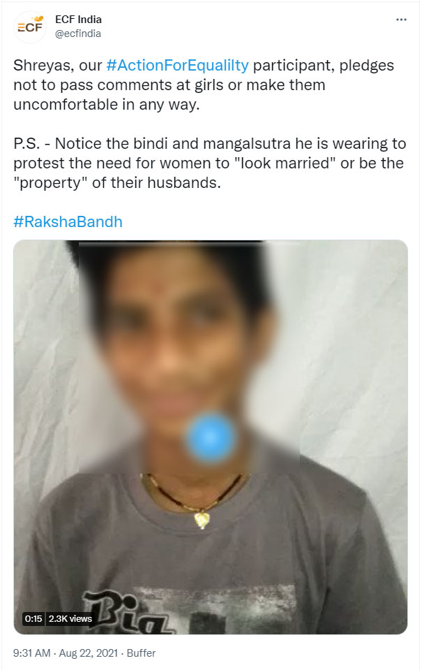 Gender activist group Equal Community Foundation published a video of a minor on Twitter on the occasion of Raksha Bandhan in which he was seen wearing a bindi and mangalsutra. In the tweet, the group wrote, “Shreyas, our #ActionForEqualilty participant, pledges not to pass comments at girls or make them uncomfortable in any way. P.S. – Notice the bindi and mangalsutra he is wearing to protest the need for women to “look married” or be the “property” of their husbands. #RakshaBandh”