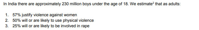 The claim “57% justify violence against women. 50% will or are likely to use physical violence, and 25% will or are likely to be involved in rape” on their website has no backing as of now. Yet, the group is actively running propaganda among minor children and making videos using them.