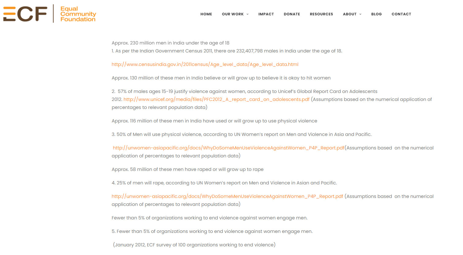 So, in order to “tackle the epidemic by raising every boy in India to be gender-equitable”, they created the organisation with a possible outcome to raise “Gender Equitable Boys”. The group states that they have “remarkable success” towards their mission. Interestingly, in its strategy document, the group referred to a link ecf.org/data, the screenshot of the page can be seen below.