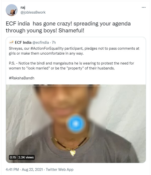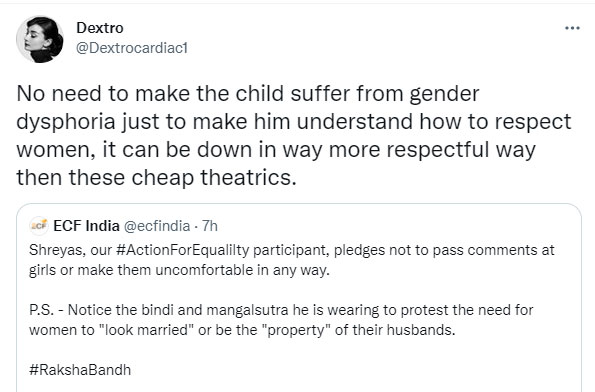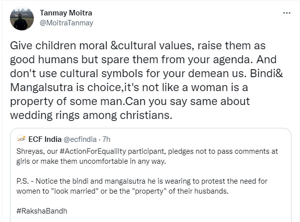 One Twitter user called out Equal Community Foundation for demeaning Hindu festivals by creating the hashtag RakshaBandh. She wrote, “What nonsense. Demeaning our #Rakshabandan festival by creating a # RakshaBandh. Demeaning our sacred Mangalsutra, Bindi etc. Using an innocent boy for your bigotry.”