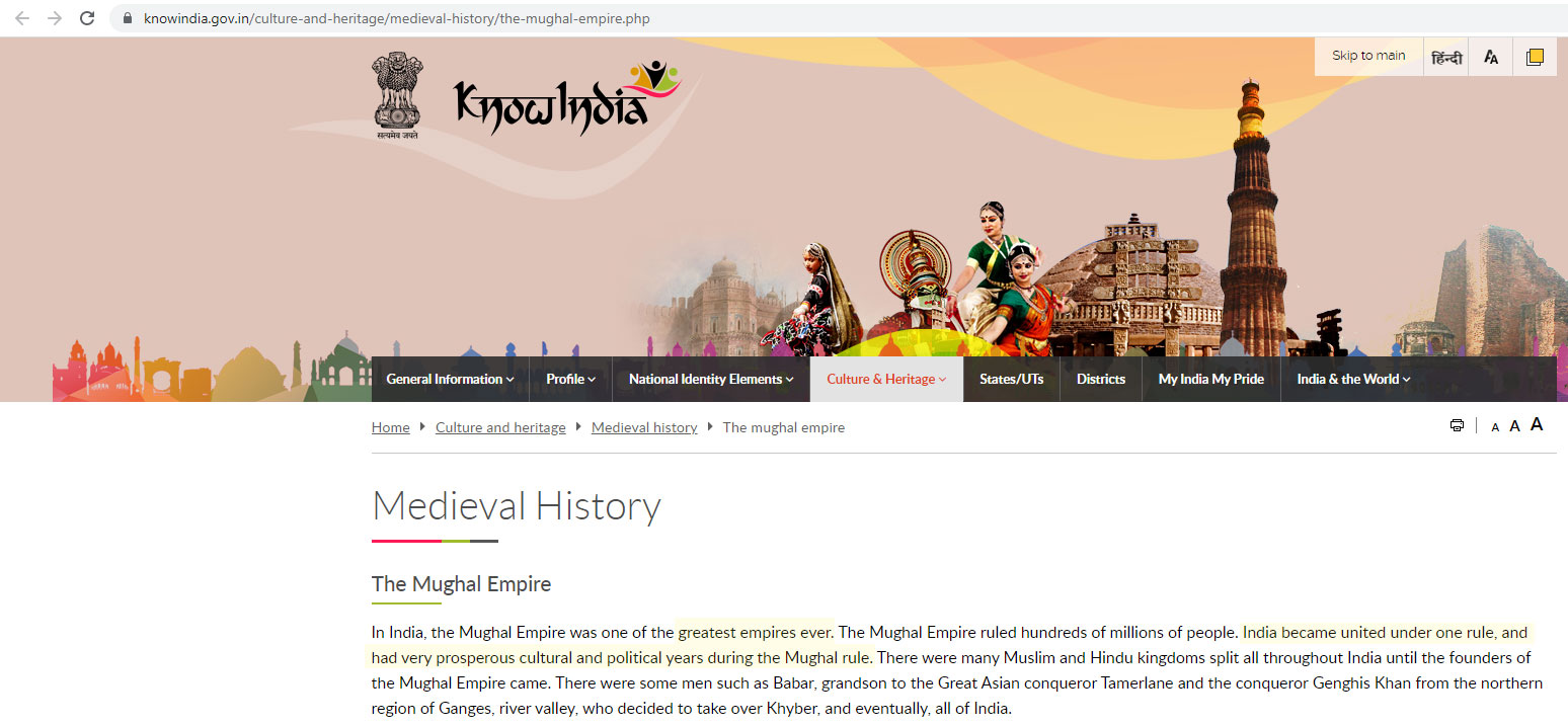 In the ‘culture and heritage’ section of the KnowIndia website, the Medieval History section sings the glory of the Mughal empire, with many distorted details and no mention of the atrocities inflicted by them.