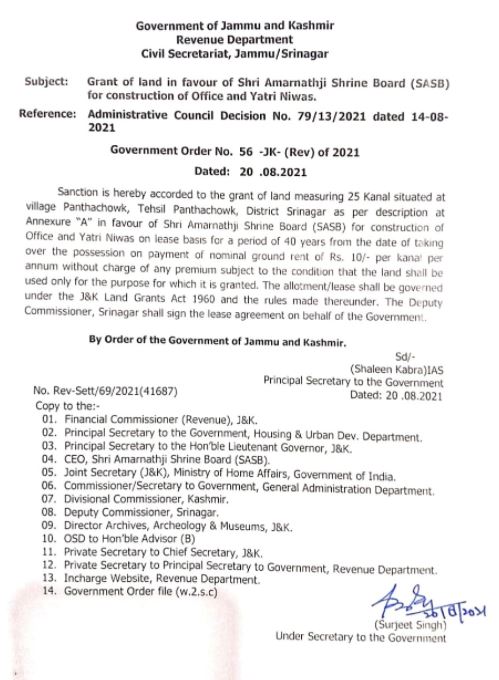 The revenue department issued an order on Friday, August 20, sanctioning the Shrine Board’s lease of 25 Kanal land for a period of 40 years from the date of taking possession.