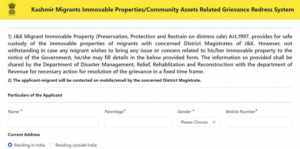 The form for the grievance redressal portal reads: “J&K Migrant Immovable Property (Preservation, Protection and Restrain on distress sale) Act,1997, provides for safe custody of the immovable properties of migrants with concerned District Magistrates of J&K. However, not withstanding in case any migrant wishes to bring any issue or concern related to his/her immovable property to the notice of the Government, he/she may fill details in the below provided form. The information so provided shall be shared by the Department of Disaster Management, Relief, Rehablitation and Reconstruction with the department of Revenue for necessary action for resolution of the grievance in a fixed time frame.”