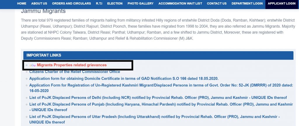 The Jammu and Kashmir government has activated an online grievance redressal portal for the Kashmiri migrants, where they can lodge their grievances related to their properties in Kashmir, if any. The service can be availed through the J & K government’s official website ‘Relief and Rehabilitation (M)’ (www.jkmigrantrelief.nic.in).