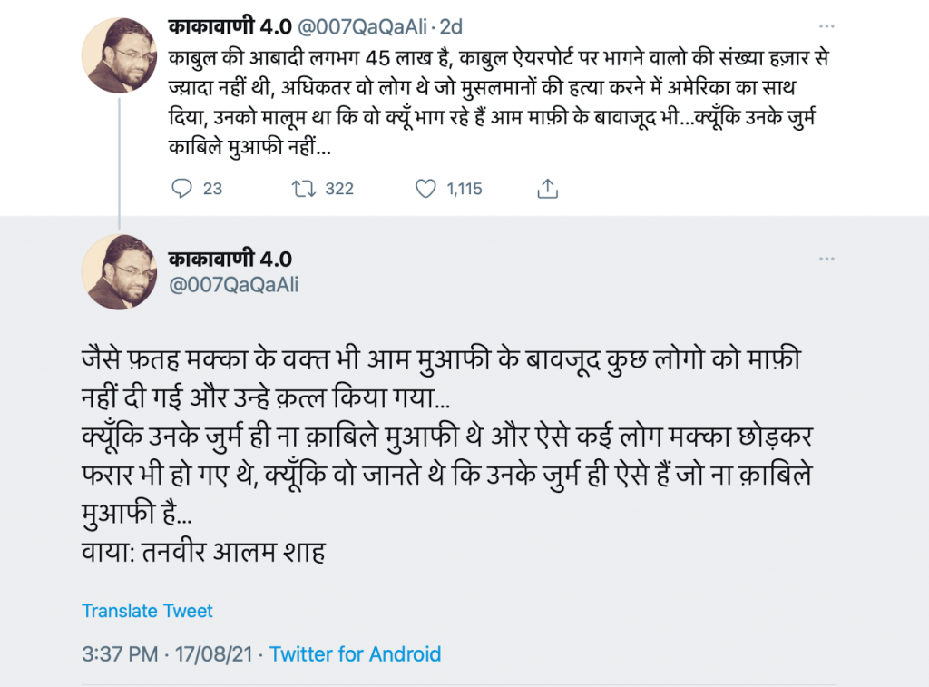 Recently, he took to his social media accounts to allege that most of the people who fled to Kabul airport were those people who had helped the United States in killing Muslims in Afghanistan. Justifying atrocities against them, the ‘journalist’ said people who were fleeing to Kabul airport committed crimes that did not deserve “pardon”.