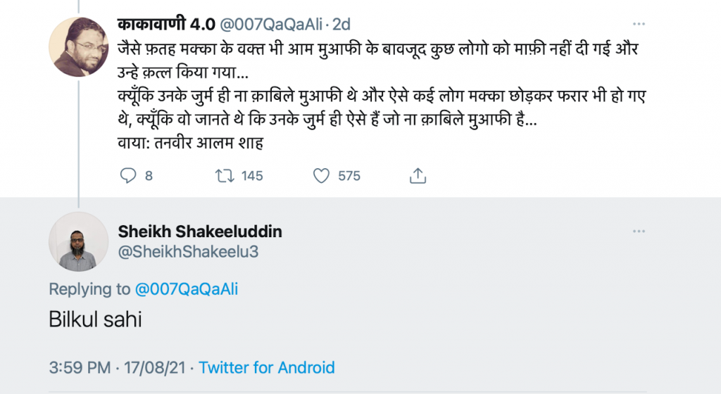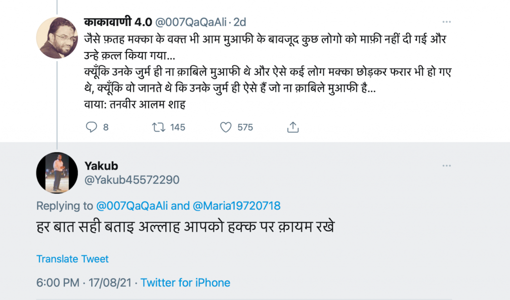The participants on the Twitter Space included one accused in the Delhi Riots case and another who has been to jail for problematic posts on social media. The riots accused remarked in the space, “Let me give you guys a piece of good news – Ashraf Ghani has resigned. Thanks to Allah! Slowly and gradually, it will lead to the establishment of the Islamic Emirate of Afghanistan (governed by the Taliban). We need to take inspiration from them and learn how to struggle in the pursuit of ‘freedom movement. (Azadi)’.”