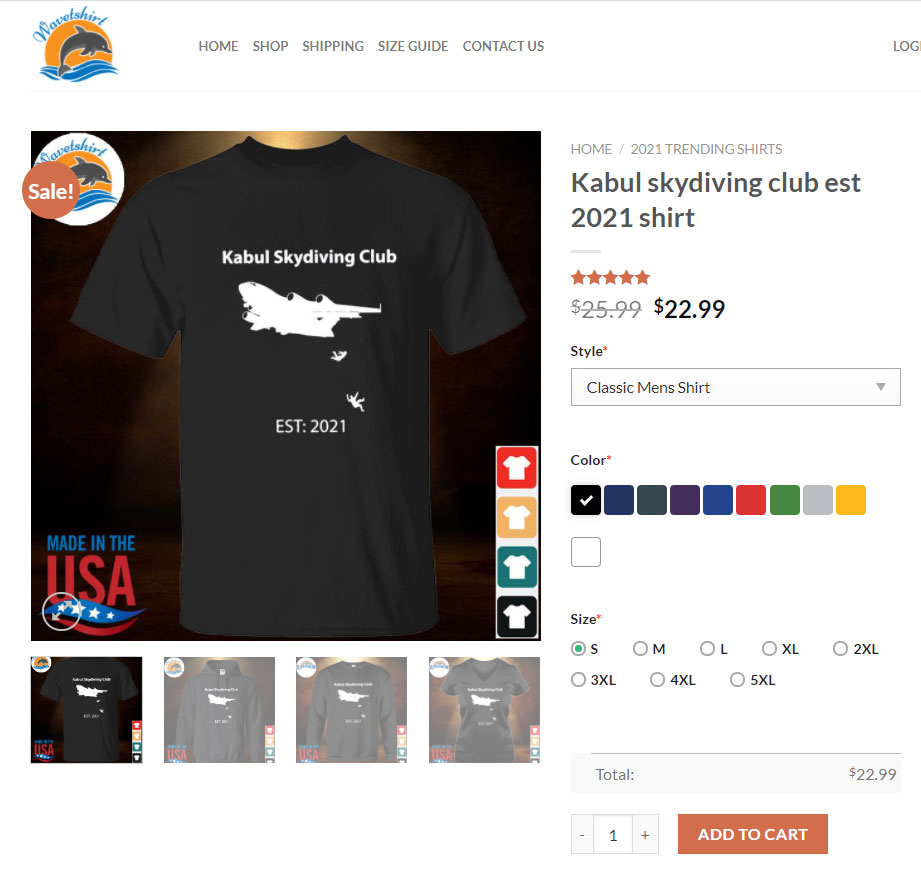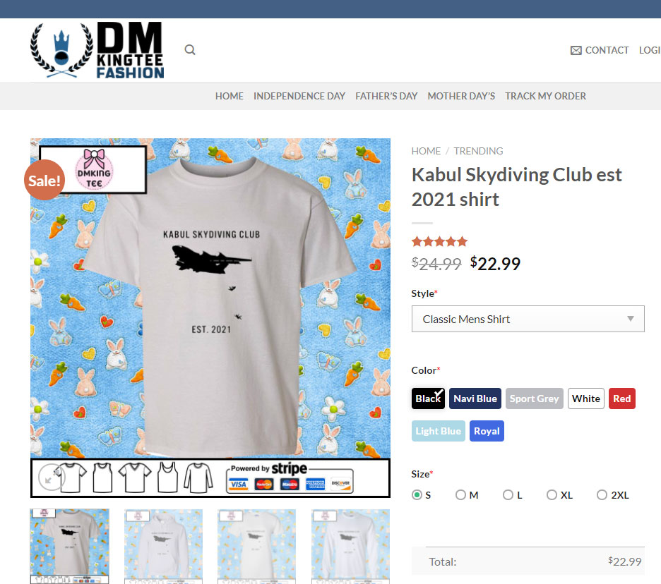 On August 22, images of T-shirts mocking Afghan nationals who fell from a US Air Force jet’s wing while trying to flee from Afghanistan went viral on social media platform Twitter. The T-shirt has a photo of US military aircraft and two people falling. The caption on the T-shirt reads, “Kabul Skydiving Club Est. 2021.”