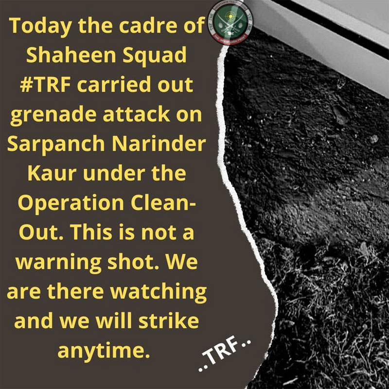As per a GoaChronicle article, the TRF have issued a poster taking responsibility for the attack. They said, “Today, the Cadre of the Shaheen Squad #TRF carried out the grenade attack on Sarpanch Narinder Kaur under Operation Clean Out. This is not a warning shot. We are there watching and will strike anytime.”