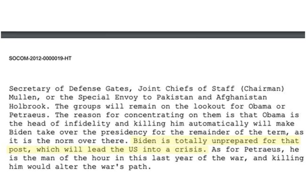 In the letter dated May 2010, Osama bin Laden had told his followers that he has no plans to assassinate Joe Biden because he deemed him “totally unprepared” to lead the United States. The letter was found in a trove of documents at the Pakistan compound where US special forces killed him in 2011.