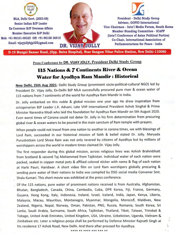 On August 25, Delhi Study Group (DSG), an NGO from Delhi, completed its mission to procure pure river and ocean water from 115 nations spread across seven continents. The collected water will be poured into the main sanctum of Ram Mandir in Ayodhya. Dr Vijay Jolly, Ex-Delhi BJP MLA and President of DSG, said, “When people could not travel from one nation to another in corona times, we with blessings of Bhagwan Ram, succeeded in our historical mission of faith and belief.”