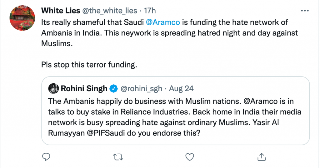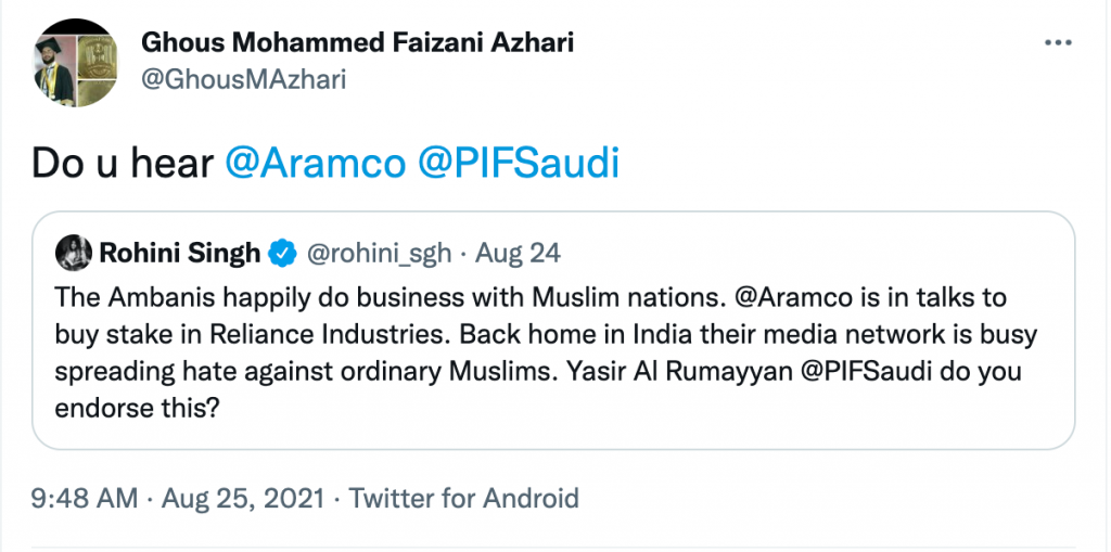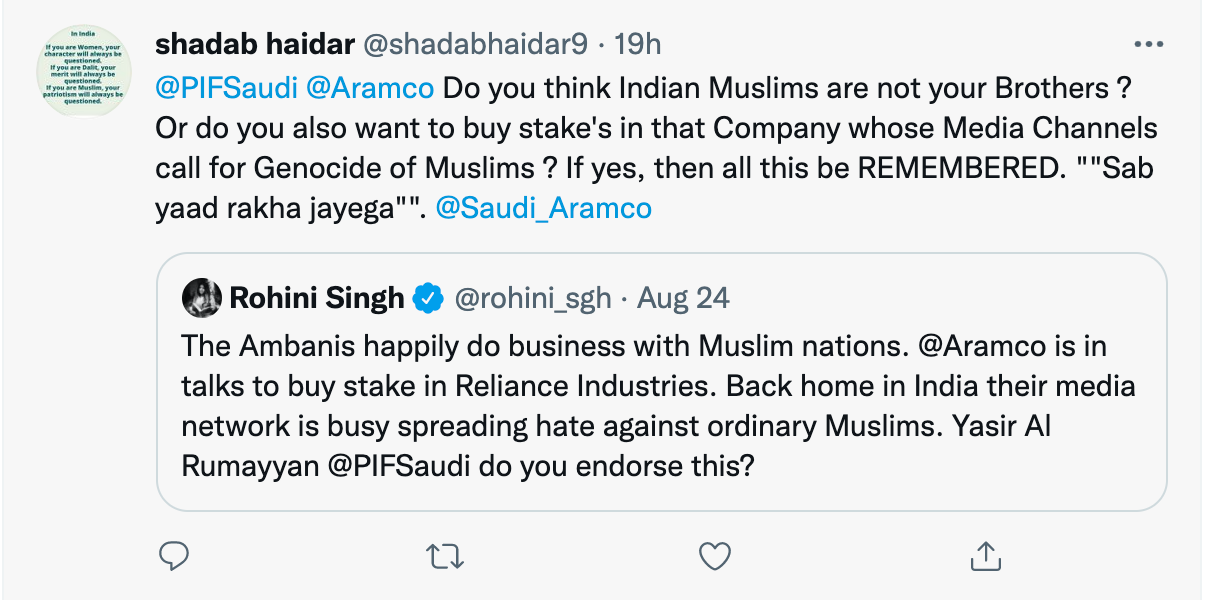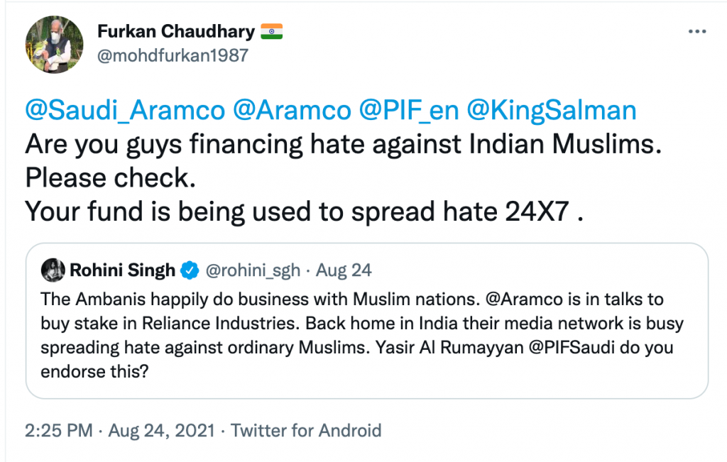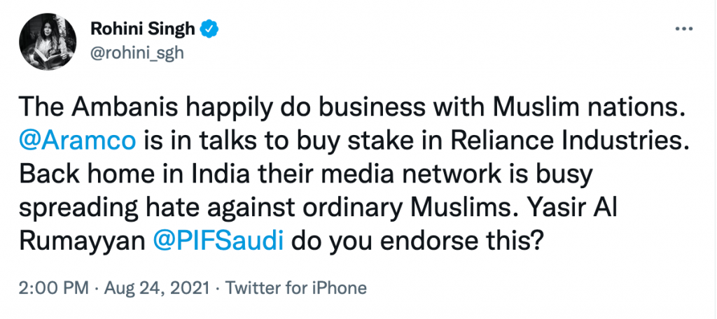 In her tweet, Singh questioned the wisdom of Saudi Arabian Oil Company Aramco for having talked to buy a stake in the Reliance Industries, whom she accused of spreading hate against Muslims in India through its media network News 18. Singh also tagged in her tweet Yasir Al Rumayyan, the Governor of PIF, asking him if he endorsed the alleged vilification of Muslims by a news network funded by Reliance Industries.