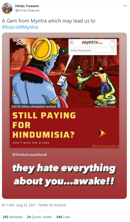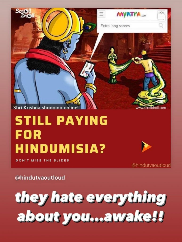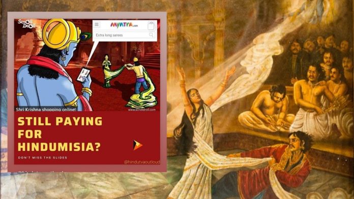The post in question features a traumatic scene from the Hindu epic Mahabharata. In a distasteful take, Shri Krishna is shown ‘shopping online for long sarees’ from Myntra as Dushashan disrobes Panchali.