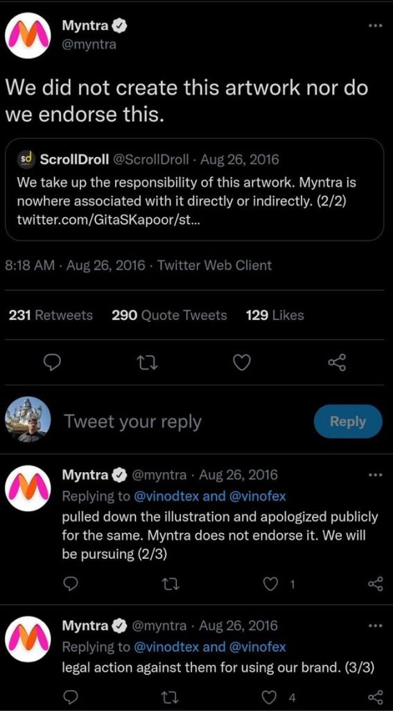 The platform also asserted that they do not endorse such content. In fact, the web portal ScrollDroll, which had made the creative illustration had also clarified that Myntra is not associated with the ad.